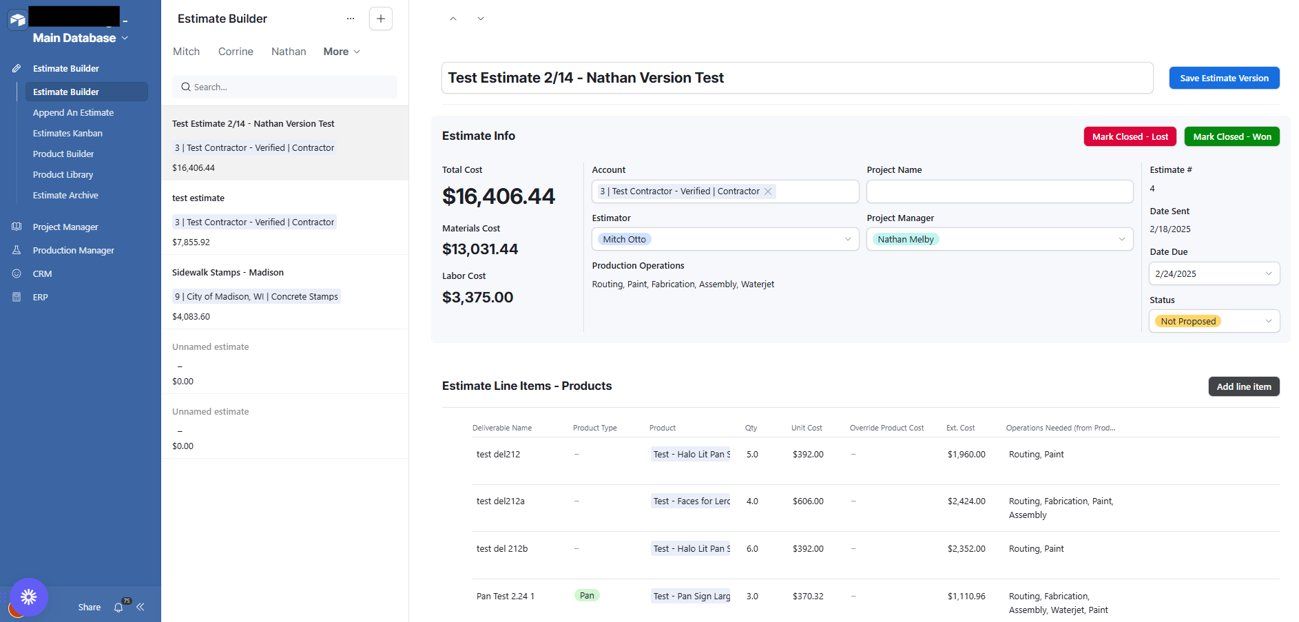- Improve data flow and data retention: Map the "data's journey" (very similar to the "hero's journey" you read about in middle school). Develop the ability to create custom products based off of estimated costs, convert the estimate to project, purchasing, and production action items, and reconcile all finances properly (in Quickbooks Online, an external app) at the close-out of a project.