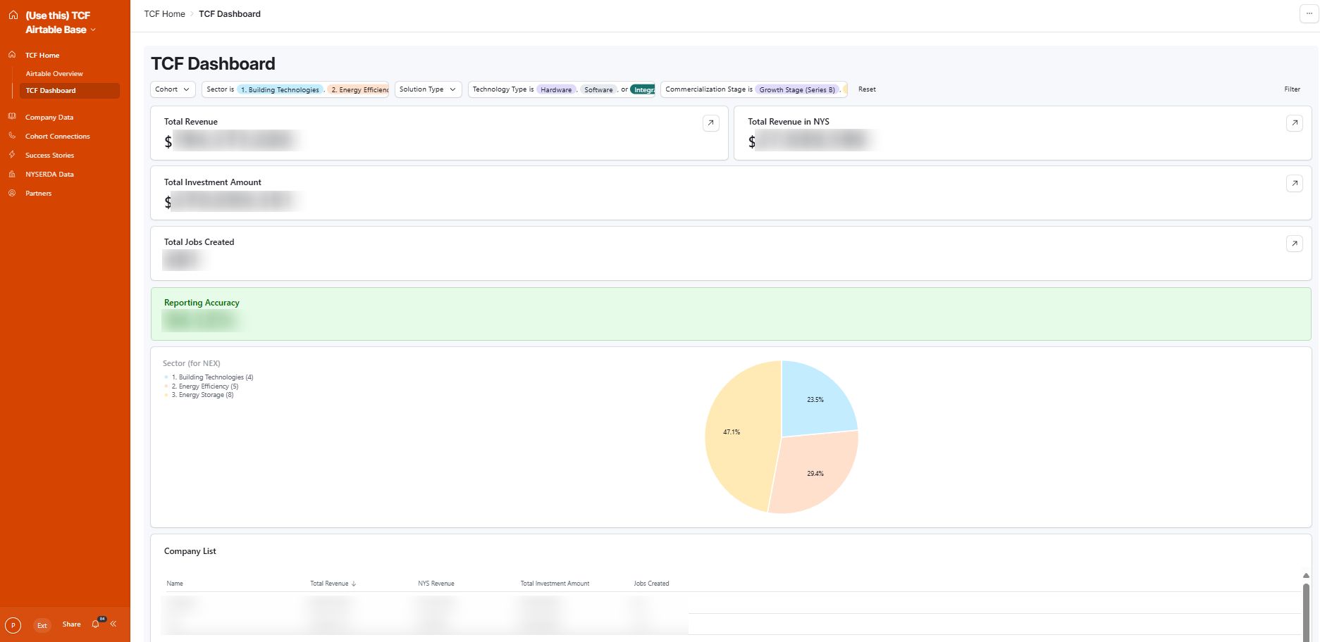 - Help create a data narrative: once all of the data was cleaned up and workflows were determined, we created interfaces to improve their ability to dive into company data and understand the way that companies have grown and changed since joining the TCF ecosystem.