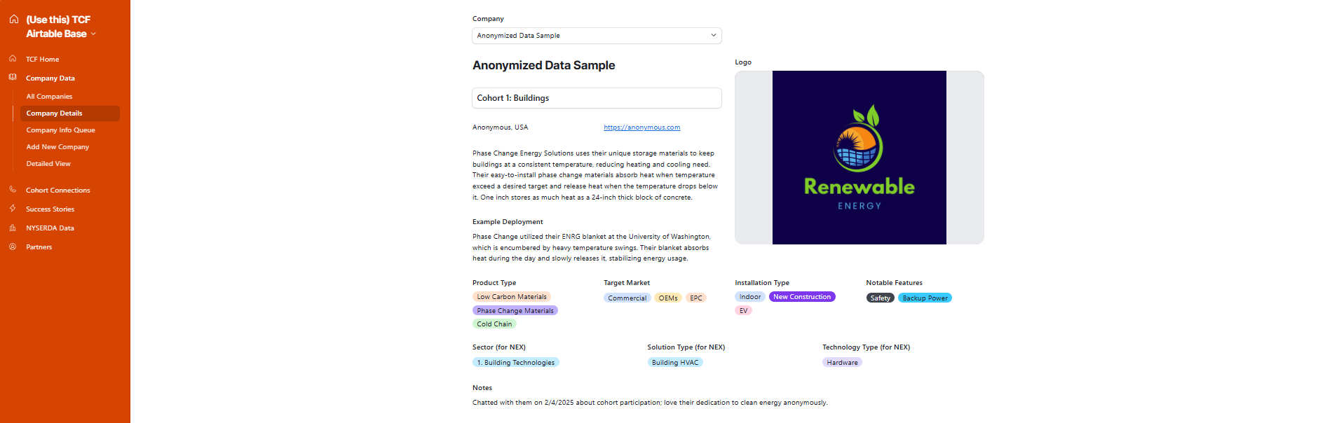 - Improve the data upload process: TCF has an externally generated report that they reference when importing data into their base. We created an easy import workflow that links companies to their relevant data records through a fuzzy matching script and some native Airtable automations.